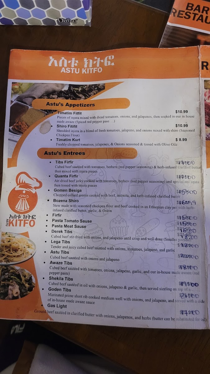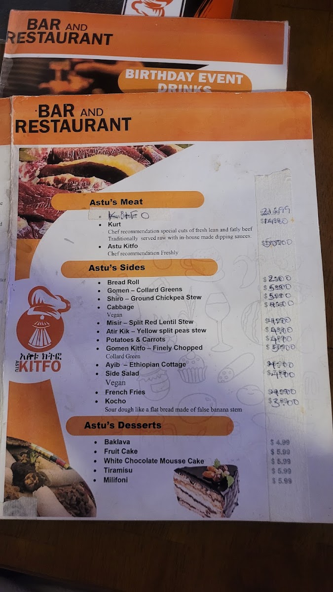 Welcome to ASTU KITFO BAR AND RESTAURANT, a standout destination in Washington, DC, for anyone seeking an authentic Ethiopian culinary experience. Here, guests are treated to a homey atmosphere enriched by vibrant music and attentive service. The menu is a rich tapestry of flavors, featuring dishes like Asfu Kitfo, presented as a generous platter with greens and an array of meats that embody traditional Ethiopian tastes.